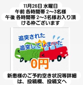 その他お休み中もLINEでのご予約だけでなく、症状や交通事故の相談など随時どなたでもお受け致しますのでお気軽にどうぞ。