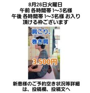 Home > 新着情報一覧 > 8月26日火曜日 ご予約 空き状況